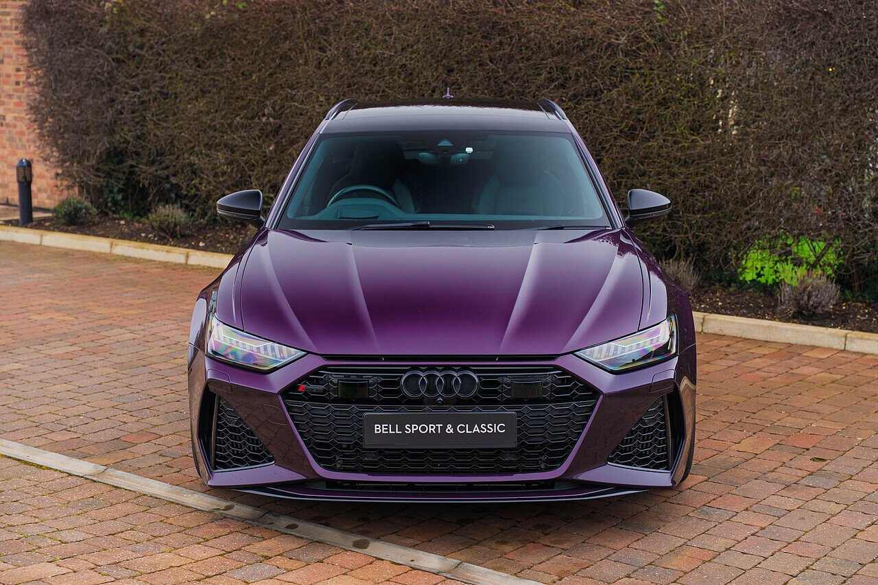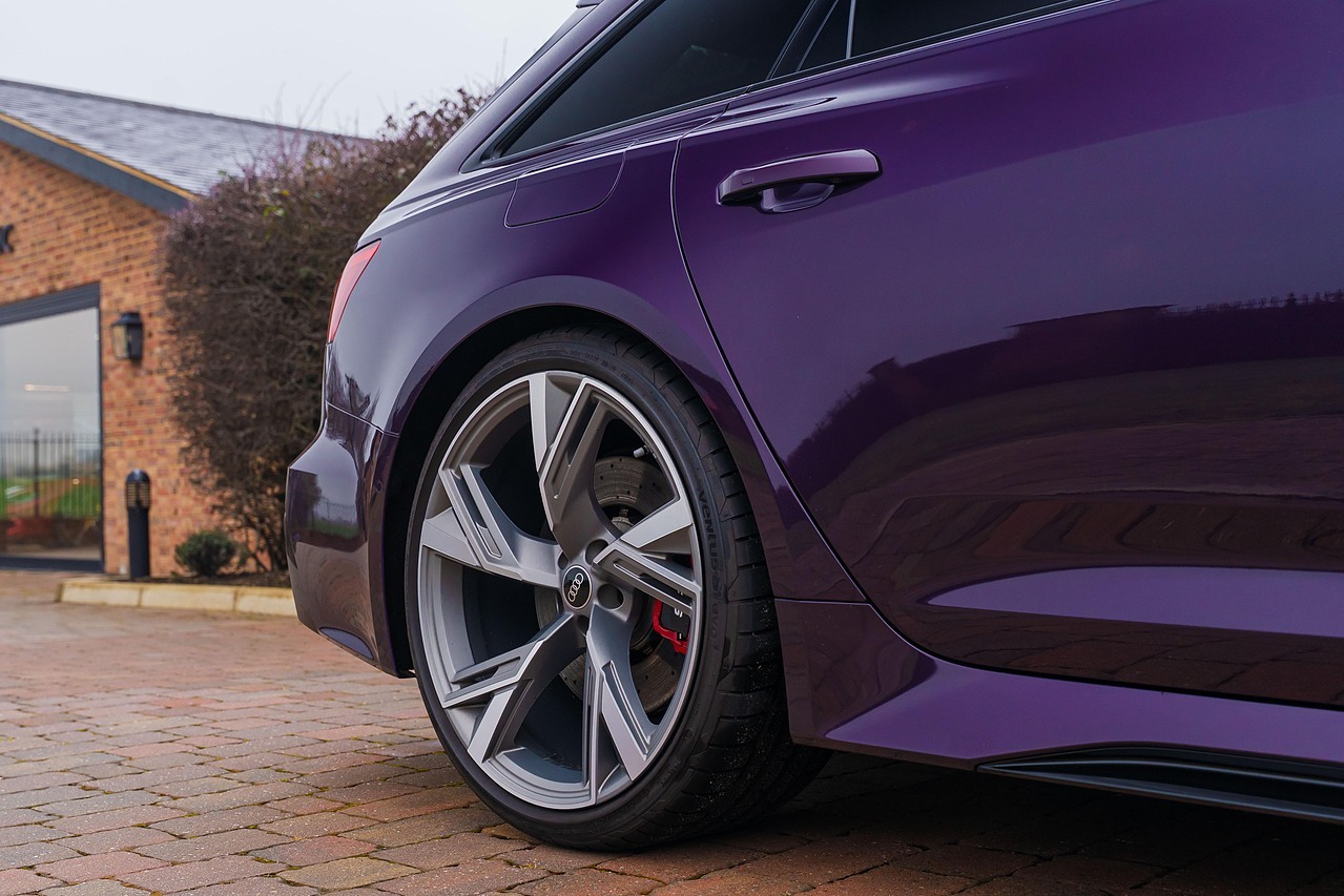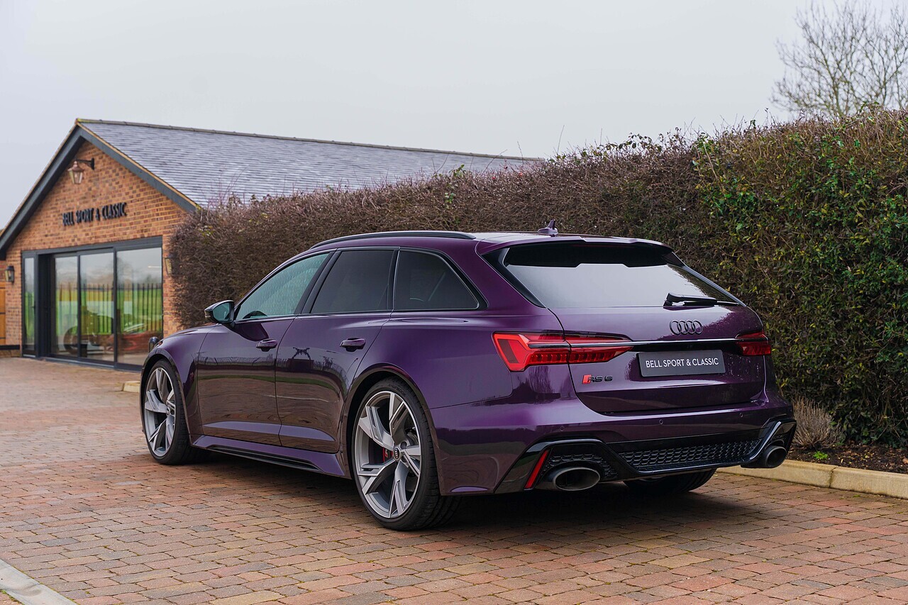 Audi RS6 Avant finished in Audi Exclusive paint Merlin Purple with Black Valcona leather and Carbon twill inlays. Spec. highlights include Sliding Panoramic Roof, Top speed increase (174 mph), Black styling pack, Comfort and Sound pack, RS Sports exhaust and Suspension with Dynamic Ride Control, 22" Five V-spoke trapezoidal style Matte Titanium, diamond-turned alloys. 30,250 miles. Full Audi history.