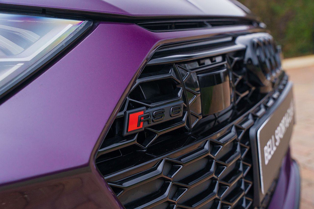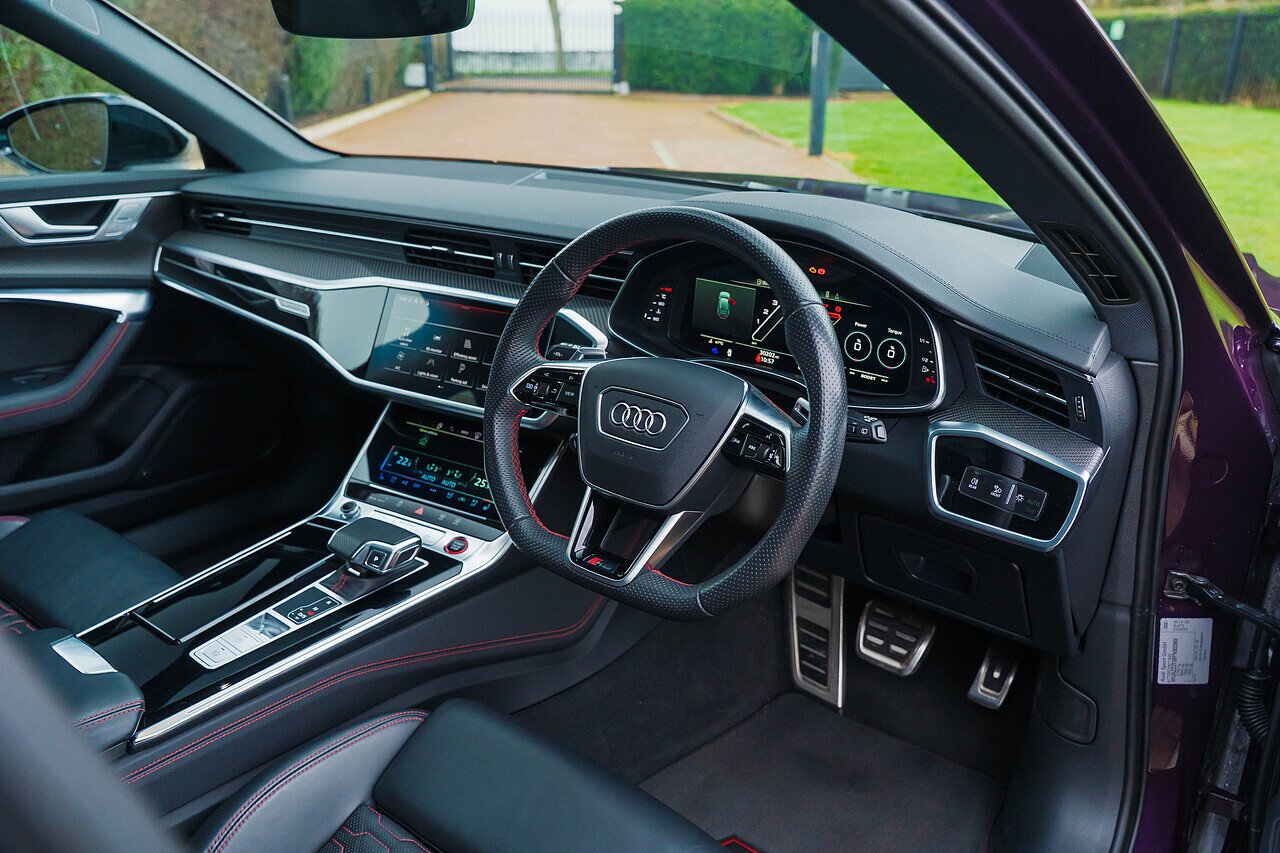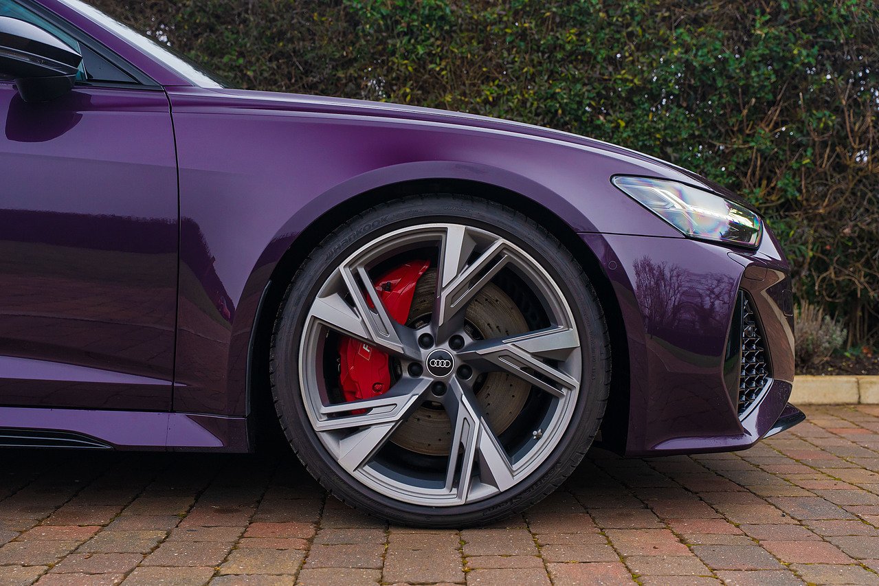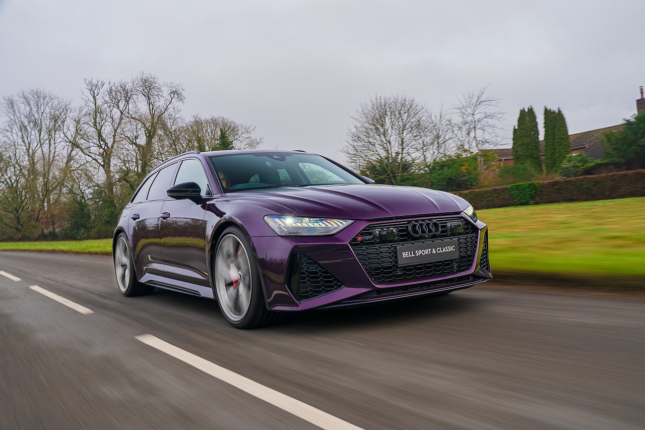 Audi RS6 Avant finished in Audi Exclusive paint Merlin Purple with Black Valcona leather and Carbon twill inlays. Spec. highlights include Sliding Panoramic Roof, Top speed increase (174 mph), Black styling pack, Comfort and Sound pack, RS Sports exhaust and Suspension with Dynamic Ride Control, 22" Five V-spoke trapezoidal style Matte Titanium, diamond-turned alloys. 30,250 miles. Full Audi history.