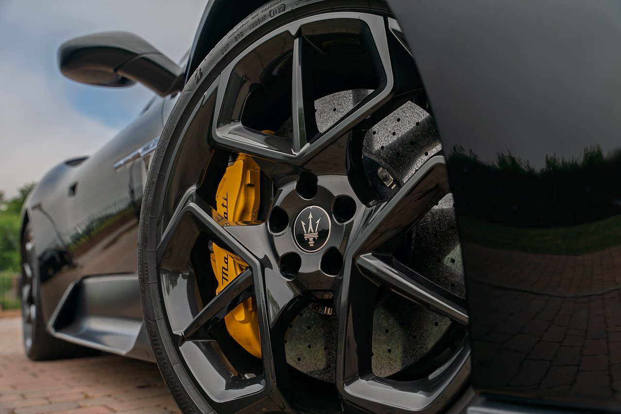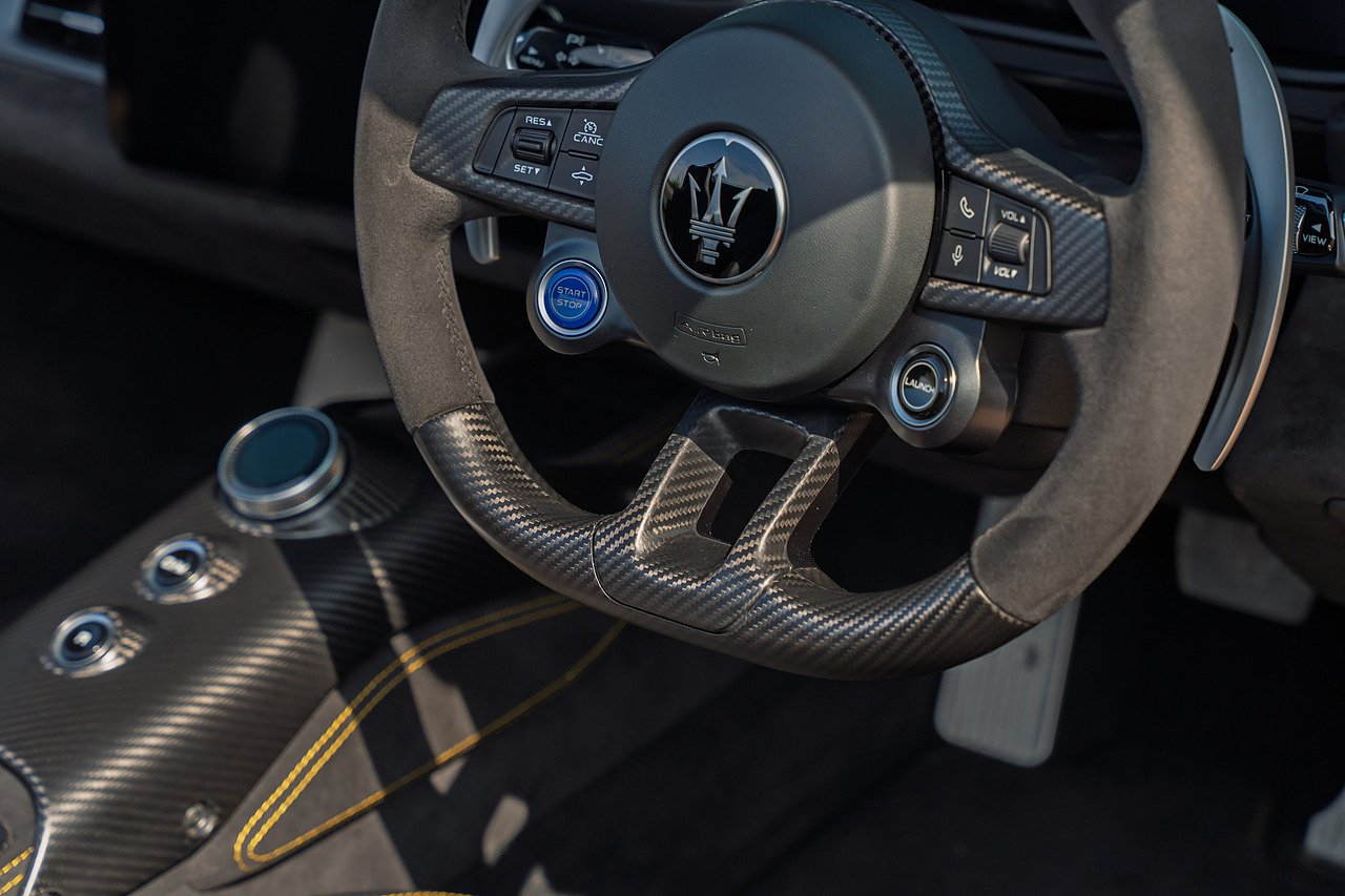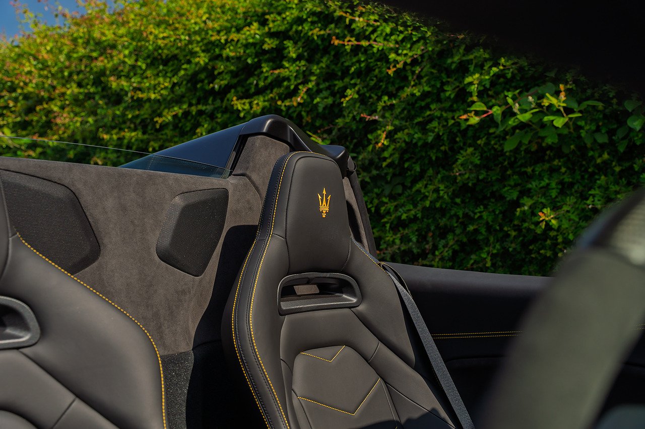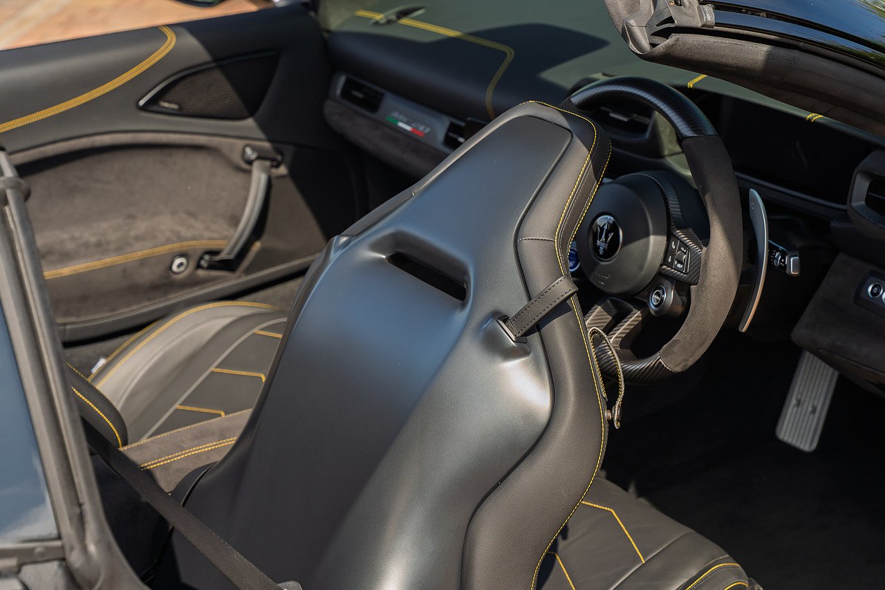 Nero Essenza with Black / Yellow leather interior, Carbon Macrotwill trim, Black carpets. Options include Suspension lift, Carbon ceramic brakes, E-LSD (limited slip diff.) 20” Birdcage Glossy Dark Miron rims, Sonus Faber High Premium Sound System. One owner. 1,800 miles. Full Maserati history. Warranty to March 2027. Service Pack.